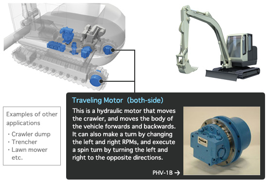 Employs a 2-speed hydraulic motor for increased traveling speed Applicable for a wide range of uses from powerful operation to high-speed movement