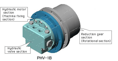 Integrated structure consisting of hydraulic motor, hydraulic valve and reduction gear enables compact size.