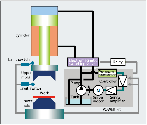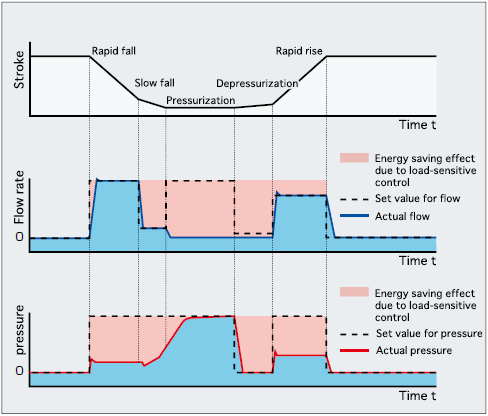With the AC servo motor, the unit rotates the pump only to the extent necessary and optimally controls pressure and flow in accordance with the movement of the machine.