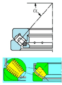 • The raceway of housing washer of this bearing type is spherical with the center of the radius located on the bearing axis. The design provides self-alignment capability to the bearing. The contact angle (α) is approximately 45° enabling the bearing to support axial load and a small to moderate amount of radial load.