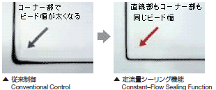 Newly developed constant-flow sealing function realizes quality application without influence of speed variation.Controlled pressure draws beautiful cornering bead application.