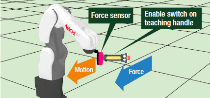 The robots can be moved directly with the teaching handles, by using the enabler switch, mounted on the end of the robots. This is a function for teaching the robots operating positions.