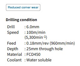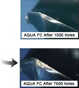 • The optimum combination of Carbide and AQUA coating provides wear and heat resistance in FC drilling, resulting in longer tool life compared with conventional FC drills.