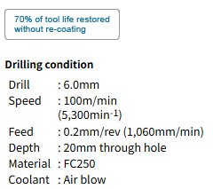 • Re-sharpening restores tool life to 70% of new drill without re-coating.
