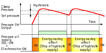 Because there is no drain flow, energy can be saved by stopping hydraulic equipment power when clamping.