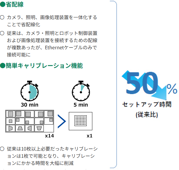 カメラ、照明、画像処理装置(サイズ)を一体化することで省スペース化を実現。