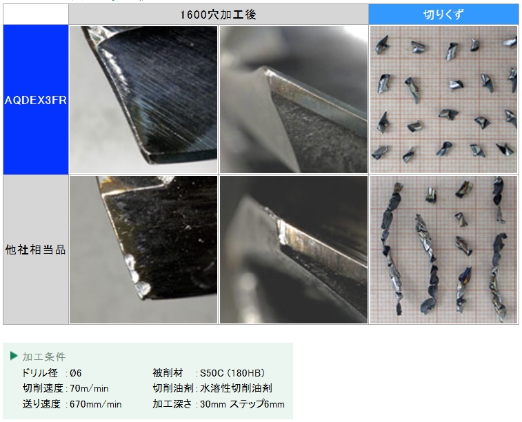 • 耐欠損性に優れた微粒系超硬合金と、耐熱性、耐摩耗性に優れたアクアEXコートを採用