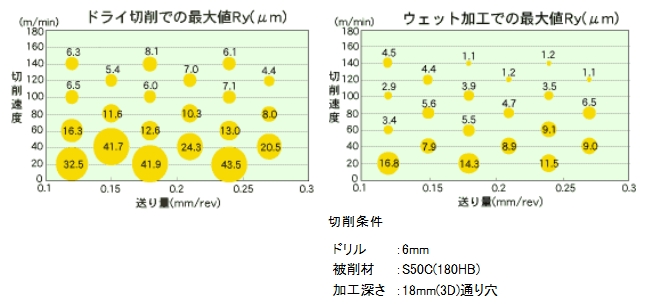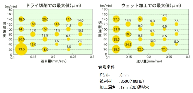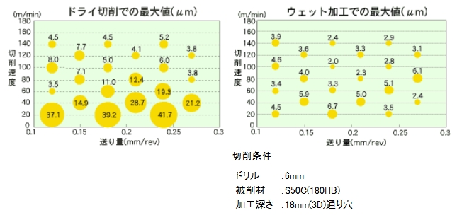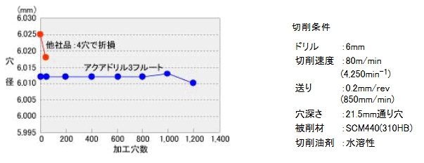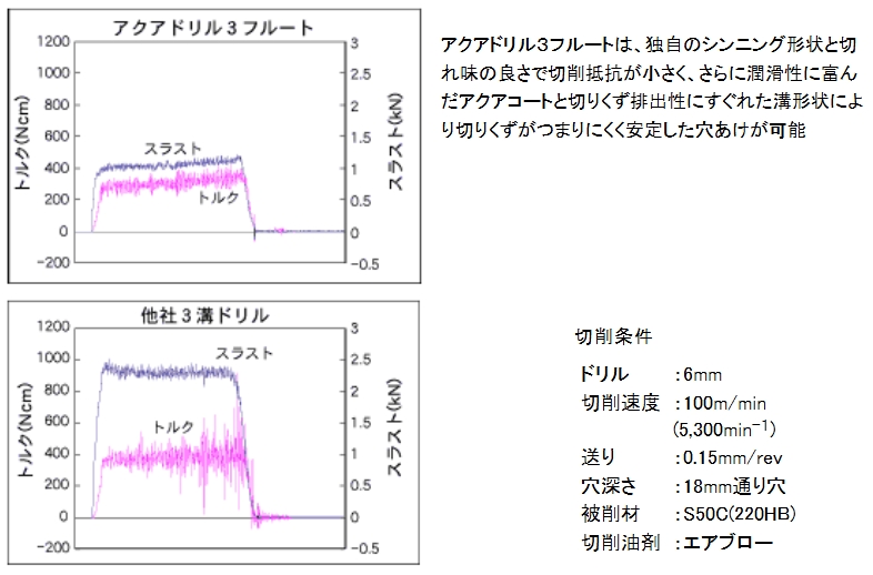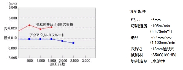 • アクアコートと切りくず排出性にすぐれた溝形状により安定した穴あけが可能 また、特殊な切れ刃形状により耐チッピング性、耐コーナ摩耗性を向上