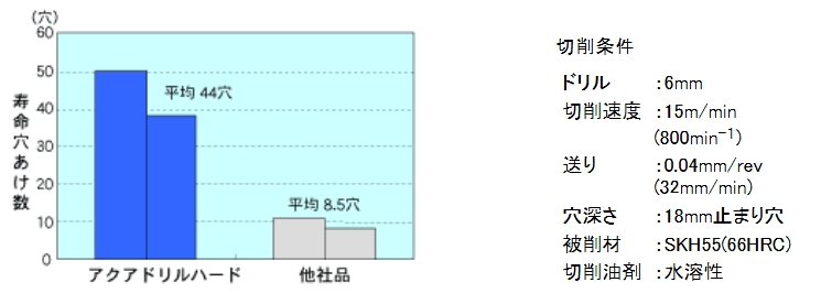 • 高硬度鋼の加工に最も適した超硬合金と耐熱性・耐摩耗性にすぐれたアクアコートの採用で、耐摩耗性・耐チッピング性が大幅に向上