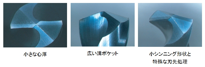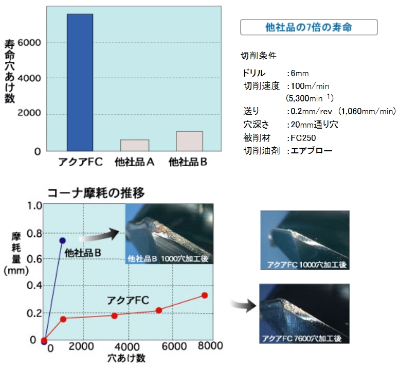 • FC材に最適な超硬合金と耐熱性・耐摩耗性に優れたアクアコートの組み合わせで、従来FC用ドリルに比べて長寿命