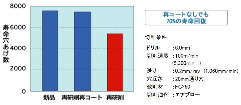 • 再研削後は再コートしなくても新品の70%寿命を確保